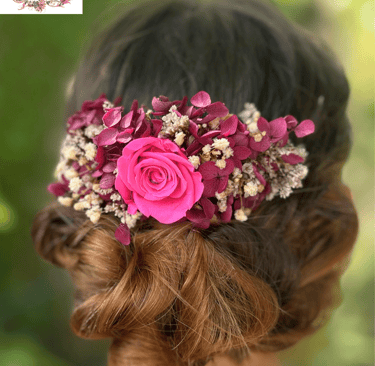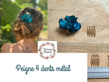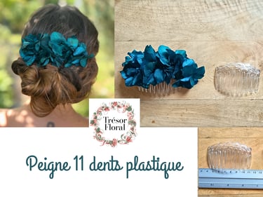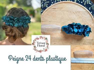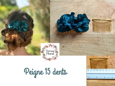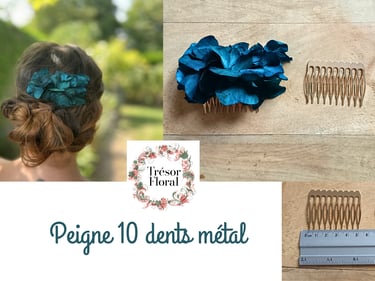 Choisir son peigne par internet peut être source d' hésitations voir de stress. En effet, maintenant on trouve un choix considérable en la matière. Voici un petit guide pour vous pour vous aider à faire votre choix. Je reste à votre disposition pour vous conseiller et vous aider dans votre choix. Voici quelques photos de plusieurs peignes de nature et taille différentes, réalisés avec les mêmes pétales d' hortensia grande taille bleu métal, sur la même coiffure pour vous rendre compte de l' effet rendu.